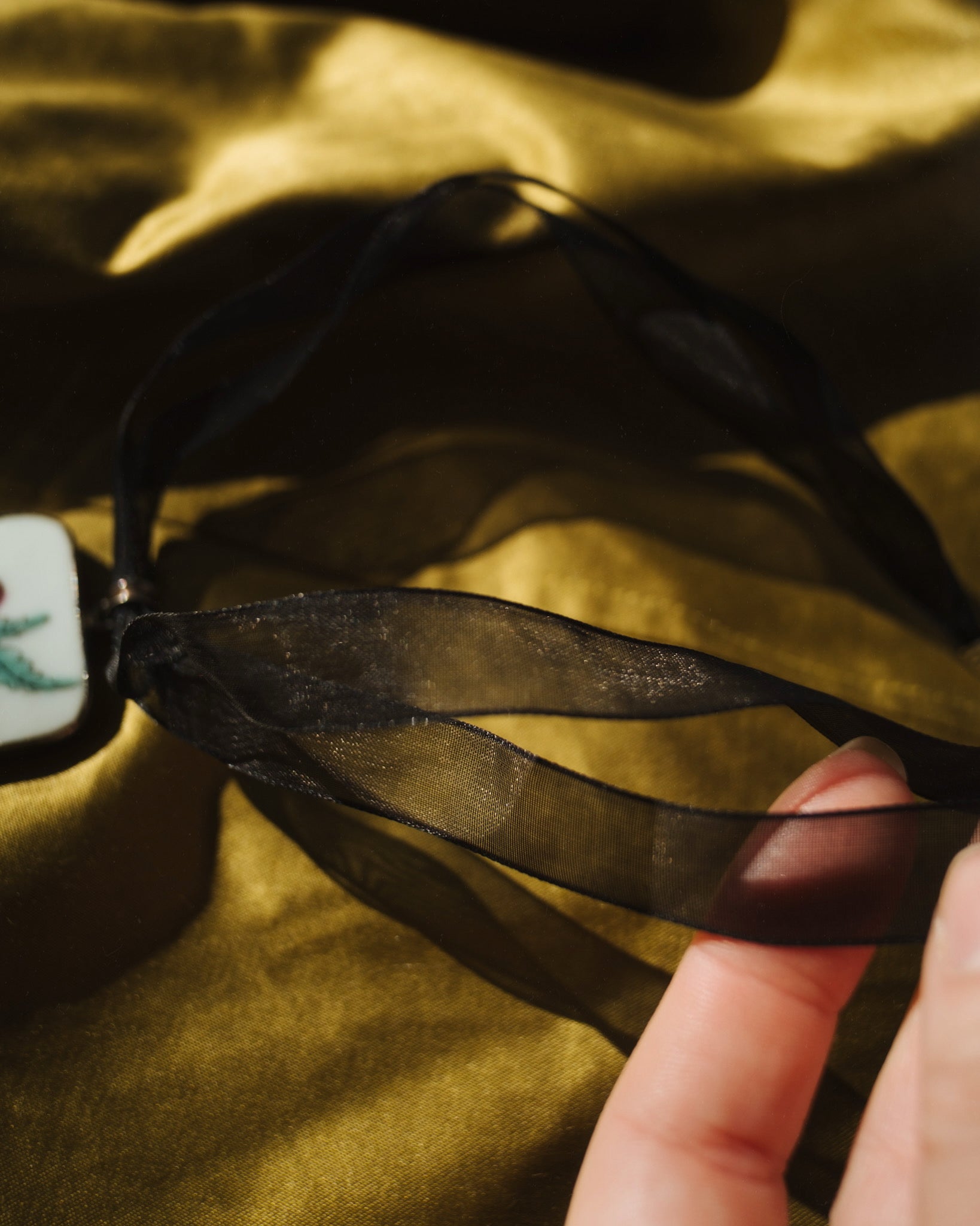 Hand painted porcelain flower pendent on black lace. Sterling silver wrapped.